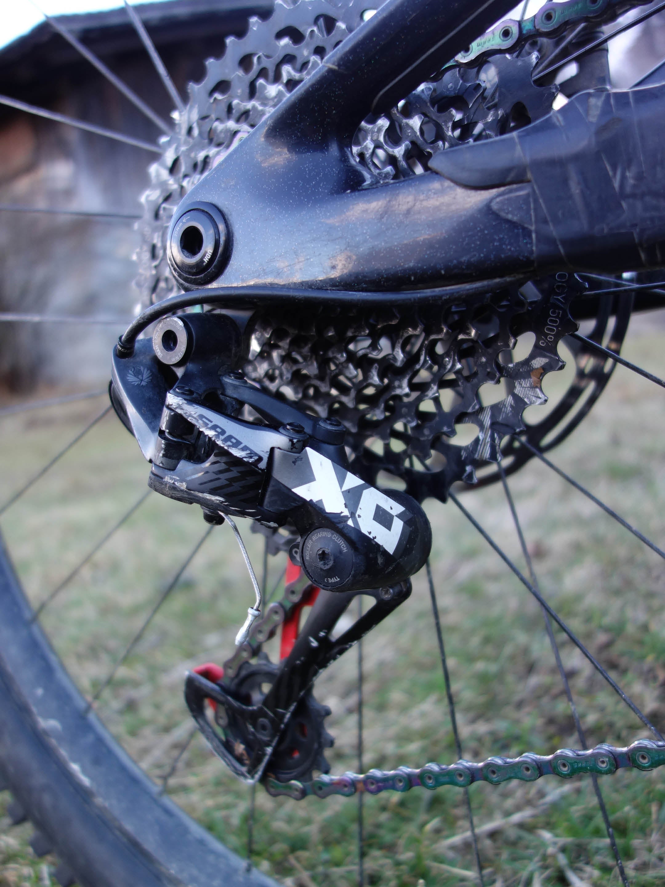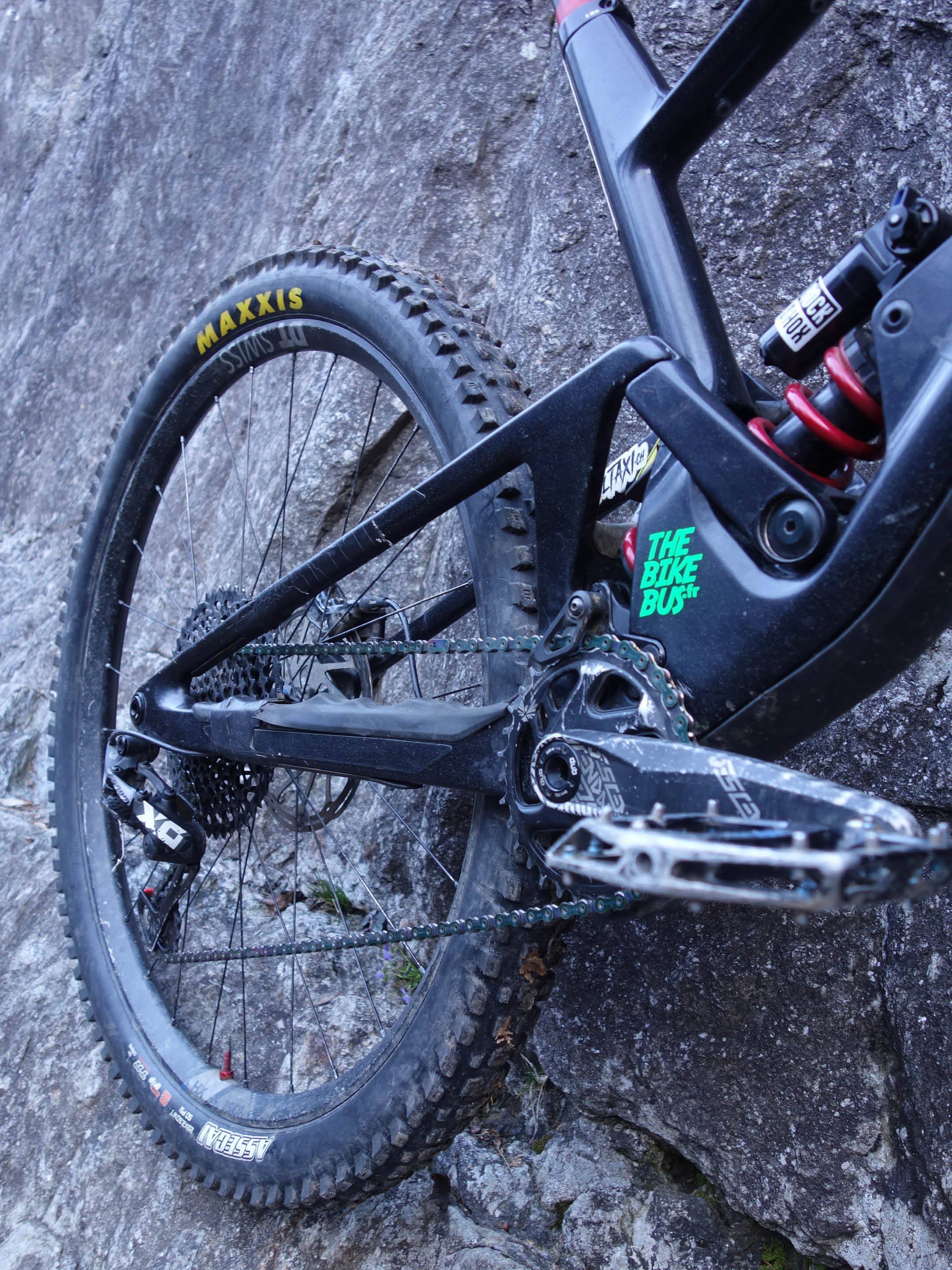 The chainstay protection, those cool rubber replicas of the Chaumont jump line, is more than a bit ragged and partly held on by black electrical tape. That same tape is layered by the shock mount to guard from a particularly aggressive bike rack. Across the frame the (rad) midnight disco black and rainbow glitter paint has the marks, scratches and chips of countless arguments with all manner of trail debris, although it looks far better than the more exposed components which have the distinctive raw metal finish you can only achieve by repeatedly hitting something off a rock.